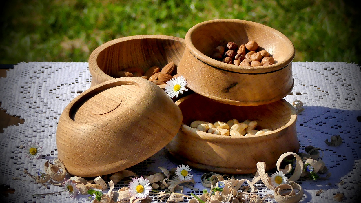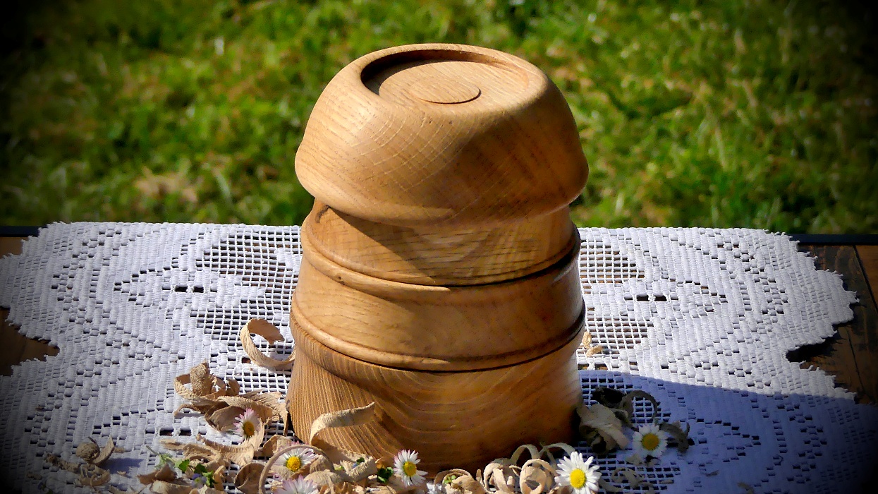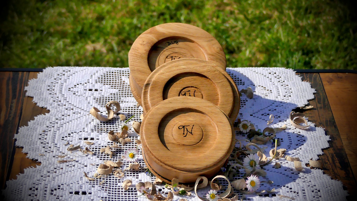 Čtyři dubové misky, které je možné seskládat do minivěže, z toho tři včetně suchých pochutin, kupř. jako překvapení pro čekanou návštěvu.