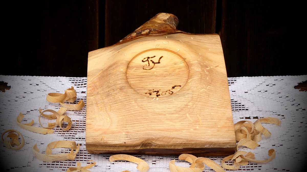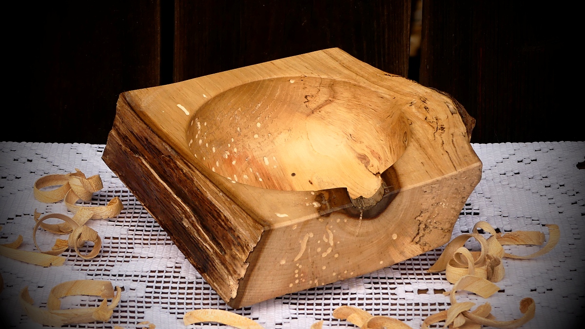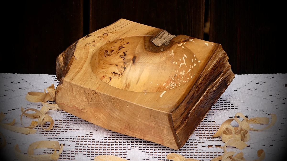Netypický tvar, zbytek větve a přírodní vykrojení - to jsou hlavní znaky této misky. Jako bonus se podařilo ošetřit a zastabilizovat chodbičky po bývalých nájemnících. Vše je pečlivě ošetřeno pro styk se suchými potravinami, kterých tato miska pojme opravdu hodně.