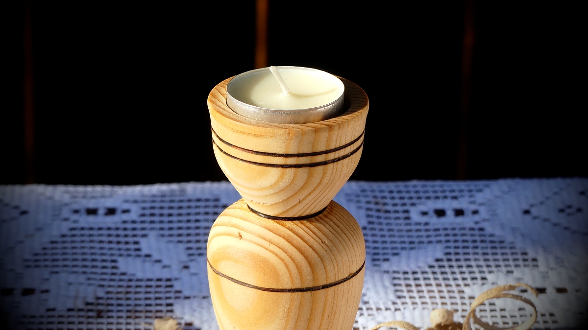 Smrkový svícen s jabloňovým podstavcem, se kterým je pevně slepený.Rozměr 14,5 x 6cm, ošetřený olejem a včelím voskem s karnaubským.