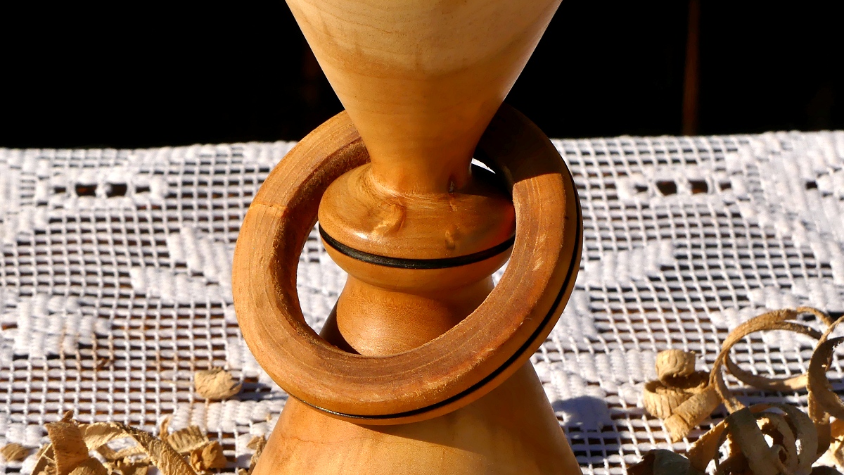 Členitě soustružený svícen se svým vzhledem řadí někam na chalupu, dřevěnku apod. Velký kroužek vtipně podtrhuje celkový vzhled.Rozměry: 26,5 x 8 cm, ošetřeno včelím voskem.